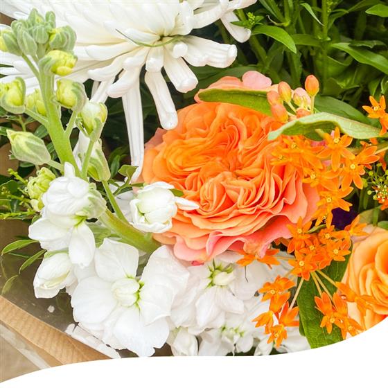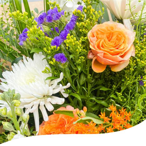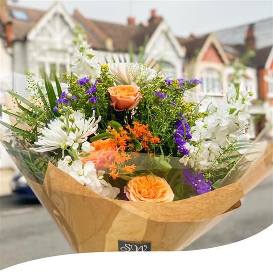 Infuse your home with summer cheer using our Summer Serenity Bouquet. This stunning bouquet combines bright orange Roses, crisp white Chrysanthemums, vibrant small orange flowers, and striking purple Statice, all beautifully enhanced by white Stock flowers and lush green foliage. Expertly crafted for a harmonious mix of colours and textures, it’s ideal for any occasion, from celebrating special moments to elevating your everyday decor.