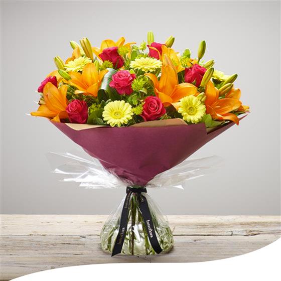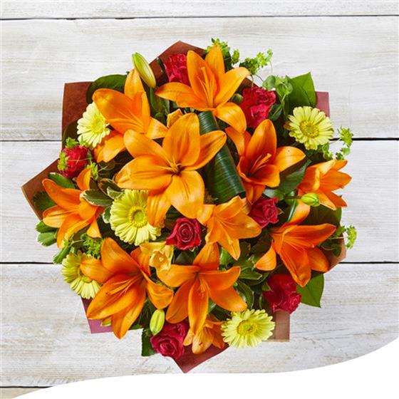 Ready to make any occasion extra special with a touch of sunshine? Experience the charm of our Summer Sunshine Bouquet (Extra Large), a grand arrangement featuring a vibrant mix of orange Lilies and pink Roses, Gerberas, and other summer flowers.