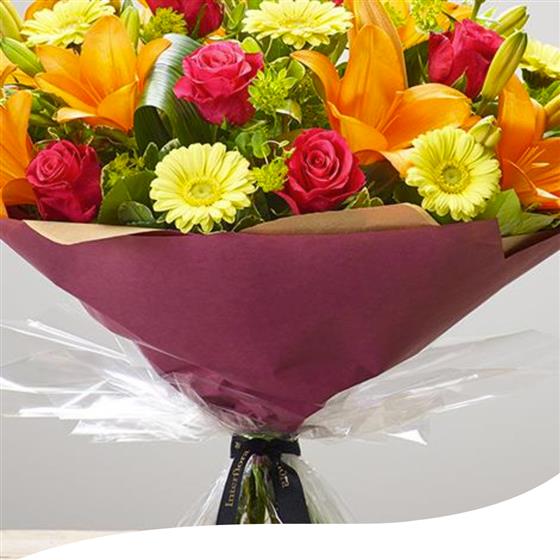 Make the day of your favourite person special with a touch of sunshine! Experience the charm of our Summer Sunshine Bouquet (Large), a stunning arrangement featuring vibrant Lilies, pink Roses, Gerberas, and other summer flowers.
