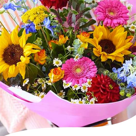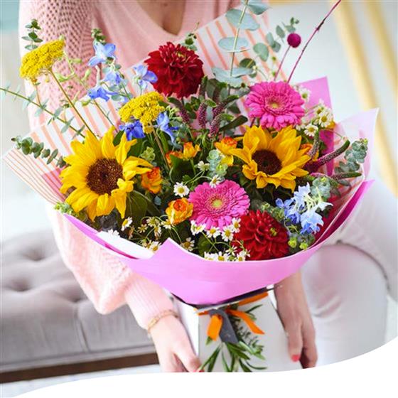 Trending Style: This bouquet features an array of lush, richly coloured blooms, including cerise, reds, fiery oranges, and pops of blue or yellow. Enhanced with dried flowers and foliage for added texture, it’s reminiscent of a vibrant summer sunset.