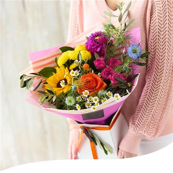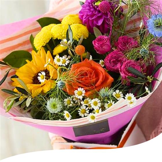 At our flower shop, our skilled florists select the freshest and most vibrant blooms each day, ensuring a bouquet that perfectly embodies the warmth of the season. This bouquet will arrive in a gift box that reflects the vibrant colours of summer.