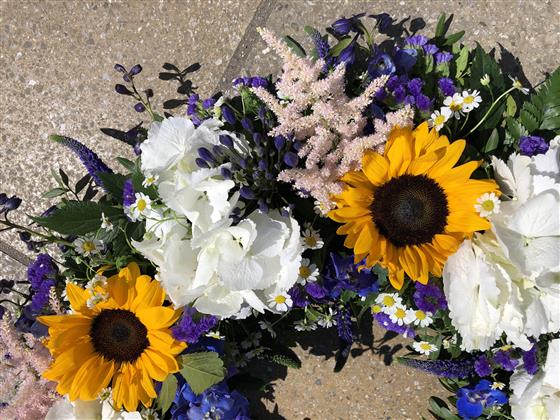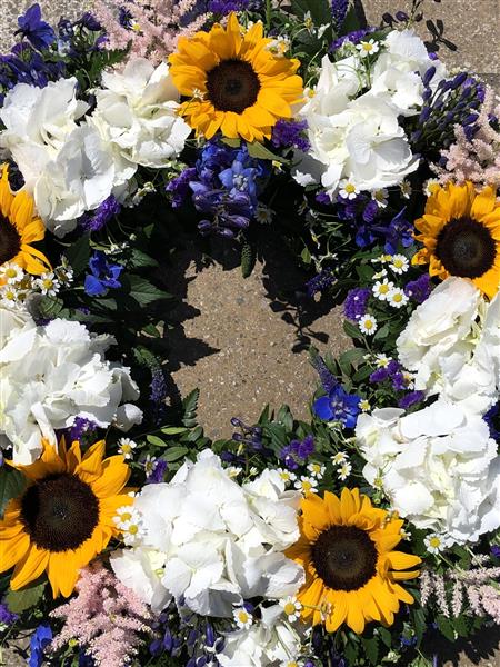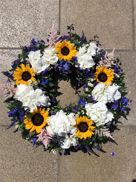 A beautiful Wreath made with Sunflowers, Delphiniums, Agapanthus, White Hydrangeas, Pink Astilbe, Purple Statice and Mixed Foliage.
