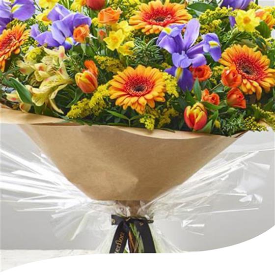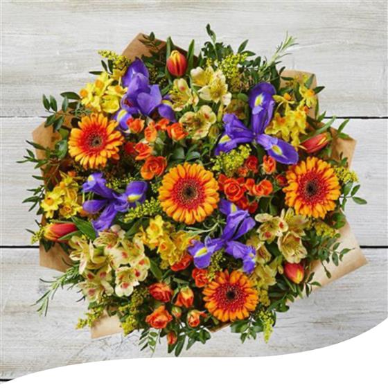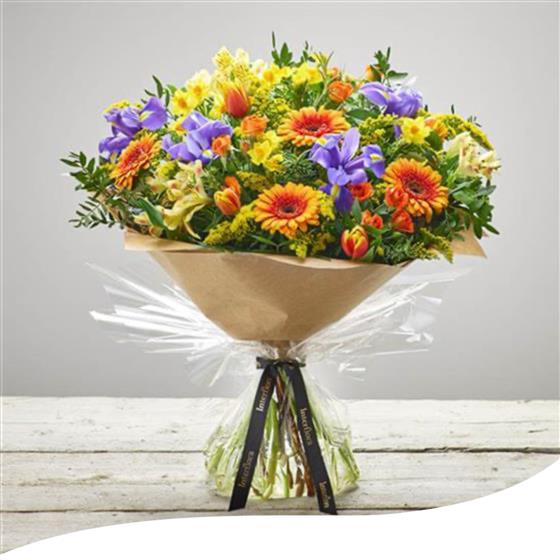 This radiant arrangement includes Yellow Narcissi, Lemon Alstroemeria, Orange Germini, Blue Iris, Orange Spray Roses, Red/Yellow Tulips and Yellow Solidago, artistically hand-tied with Pistache and Rosemary. Carefully wrapped and presented in gift packaging, it's more than a bouquet—it's a mindful journey through vibrant colours and uplifting scents. Embrace well-being with our Sunny Days Mindfloral Bouquet, a delightful addition to brighten your space and nurture your senses.