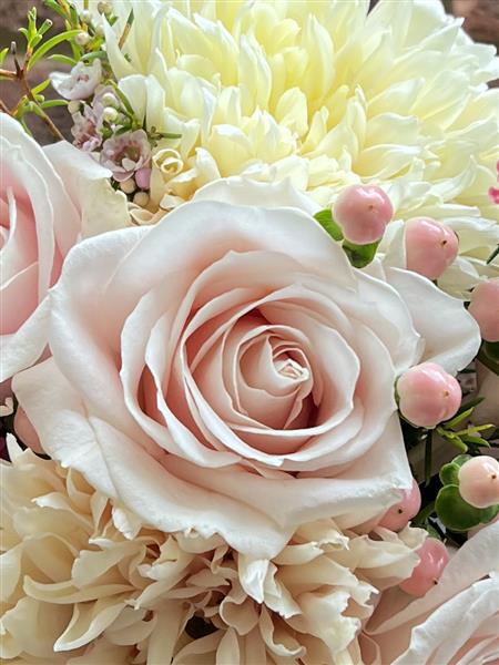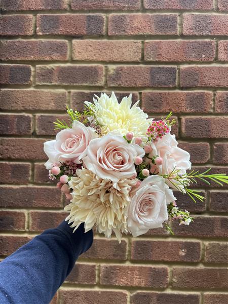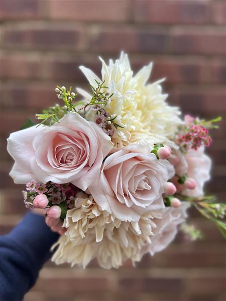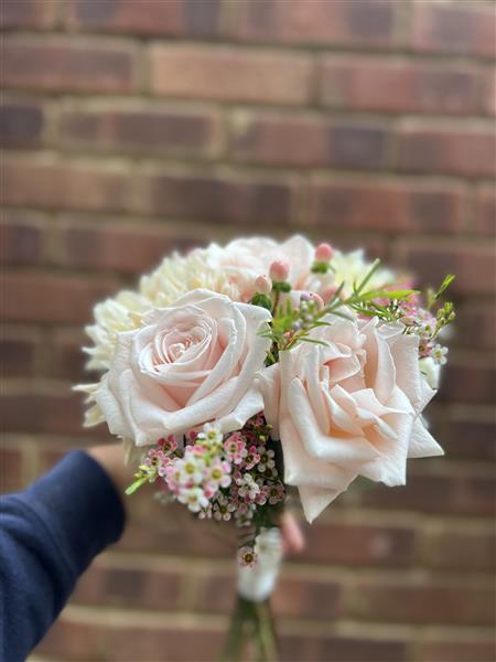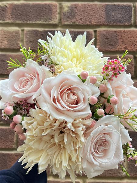 This stunner was made using Sweet Avalanche Roses, Natural Wax Flowers, Pale Pink Hypericum Berries and 2 Stunning Peach Chrysanthemum Kalimba Blooms.