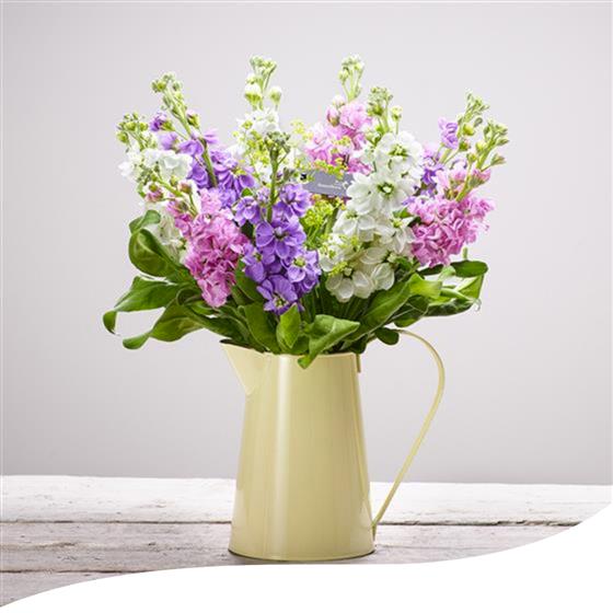 Transform your space with our stunning Sweet Stocks Jug, a beautifully crafted floral arrangement featuring pastel-coloured stocks and delicate foliage. This charming creation adds a graceful touch to any room.