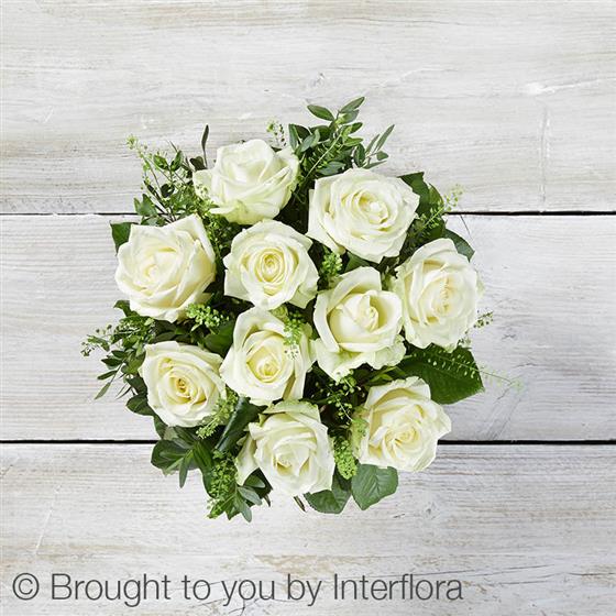 Featuring 10 large headed white roses hand-tied with thlaspi and pistache, presented in a clear swirl glass vase.