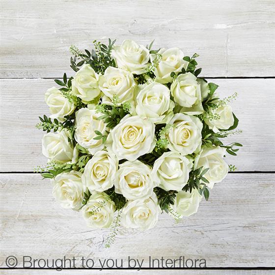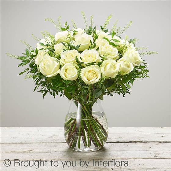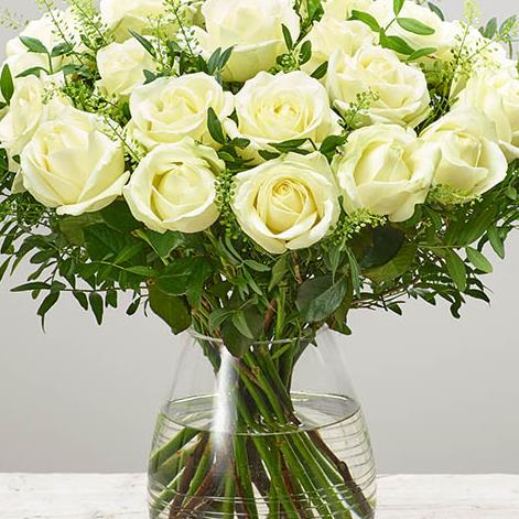 Featuring 20 large headed white roses hand-tied with thlaspi and pistache, presented in a clear swirl glass vase.