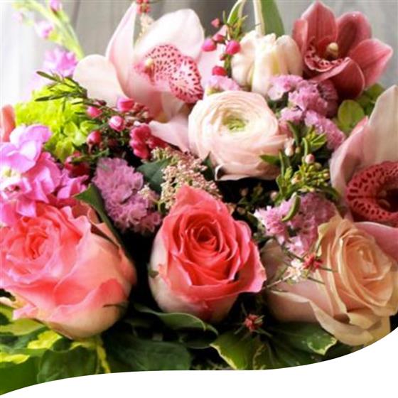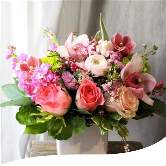 A soft pink table arrangement using pale pink shades of Cymbidium Orchids and Tulips, with lilac Stocks, pink Ranunculus and finished off with sprigs of mixed woodland foliage.