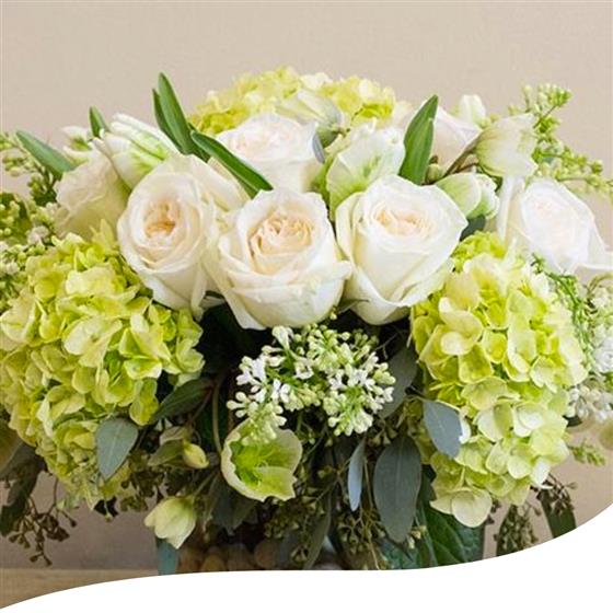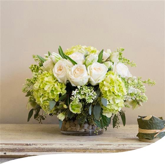 Table Arrangement White & Green Hydrangea & Rose