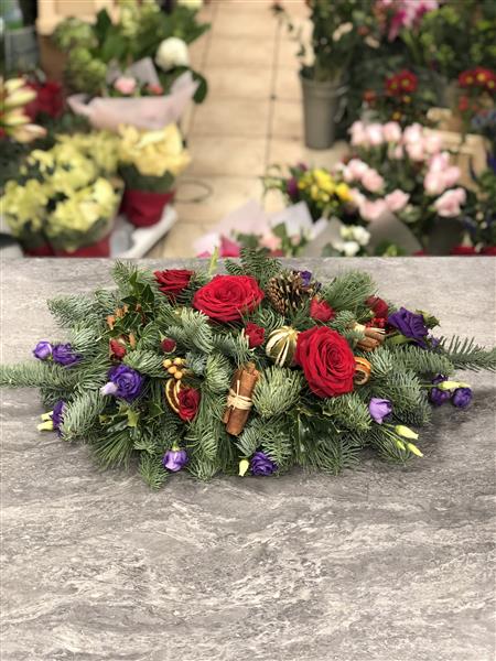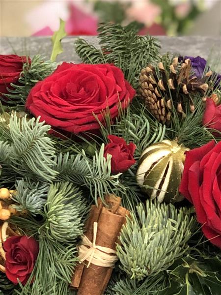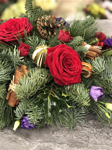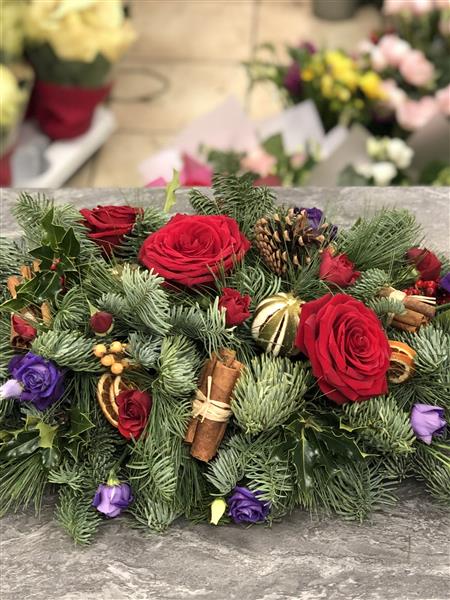 Red Roses, Purple Lisianthus and Red Spray roses with dried Limes, Cinnamon Sticks, Orange Slices and Pine Cones.