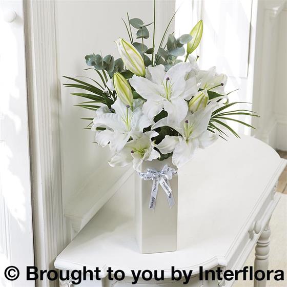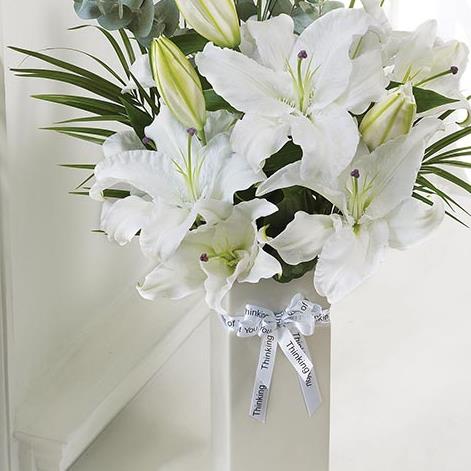 Featuring white Oriental lilies, palm leaves, eucalyptus and salal presented in ceramic vase and finished with a ‘thinking of you’ ribbon.