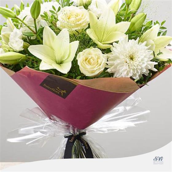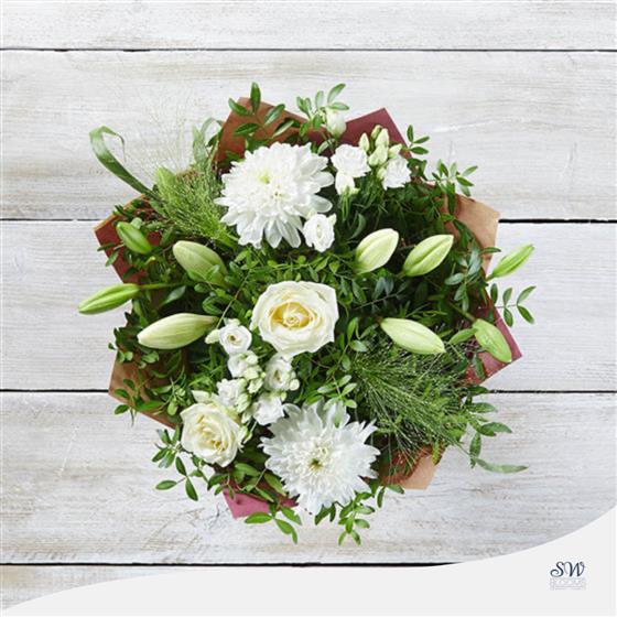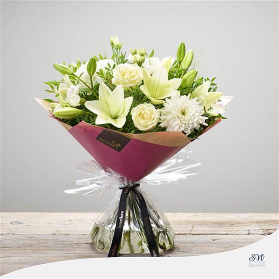 This elegant hand-tied bouquet showcases a timeless arrangement of White Large-Headed Roses, White LA Lilies, White Chrysanthemum blooms and white Lisianthus, beautifully complemented by Salal, Pistache and Panicum Grass. Expertly hand-tied, wrapped, and presented in gift packaging, this bouquet captures the pure beauty of white flowers.