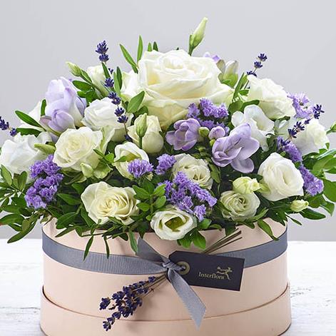 Featuring a ivory large headed rose, white spray roses, purple freesia, a white lisianthus, purple statice, dried lavender and pistache, presented in a soft nude 'keepsake' hatbox trimmed with ribbon.