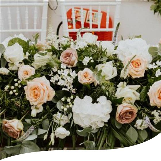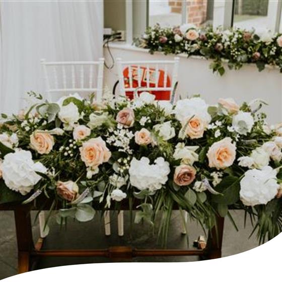 A large long and low top table arrangement made with a beautiful selection of Peach, Lilac, Pale Pink and Cream.