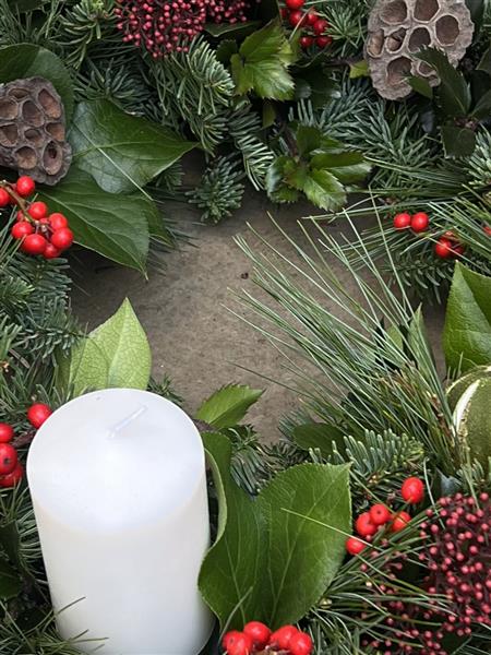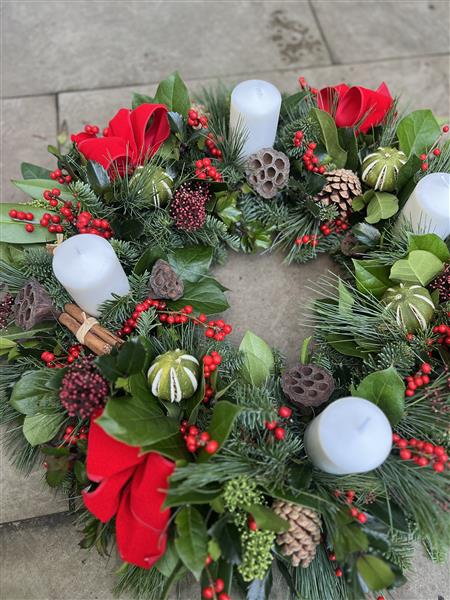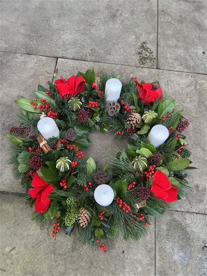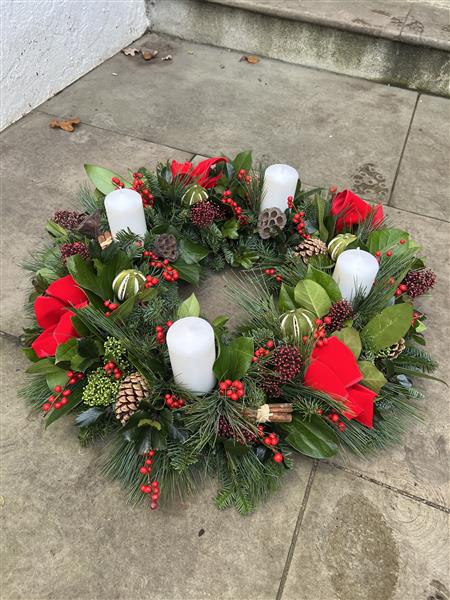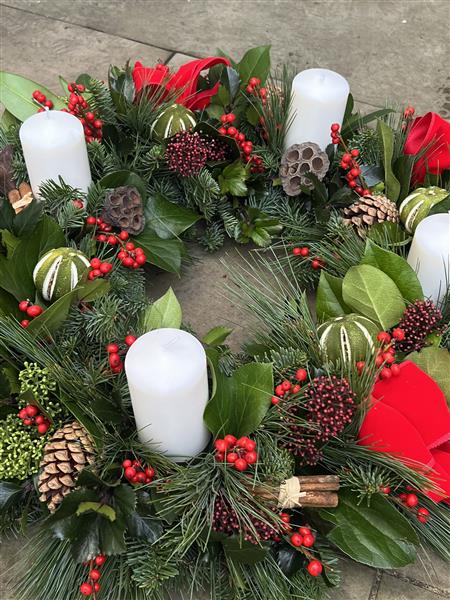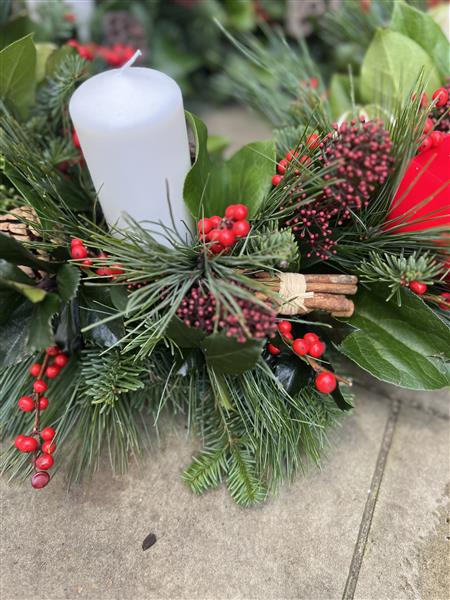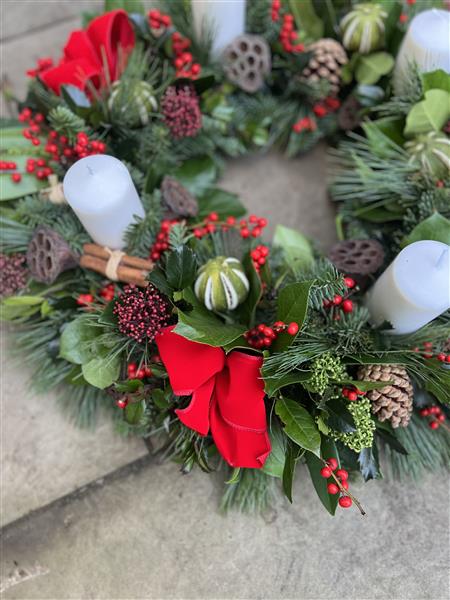 A traditional large advent wreath with 4 pillar candles that will last well through advent. We will use a beautiful selection of pines and foliage to create the base. We decorate with dried fruits such as limes and oranges, Cinnamon twigs, lotus heads, Pine Cones, Velvet ribbon bows and Sliced dried fruits. We used fresh Red ilex Berries and both Green and Red Skimmia into this beautiful traditional advent wreath.