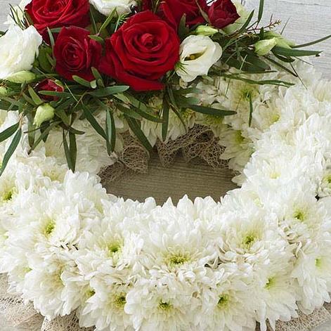 A traditional wreath of white chrysanthemums contrasted with a cluster of pretty roses, lisianthus and delicate foliage.