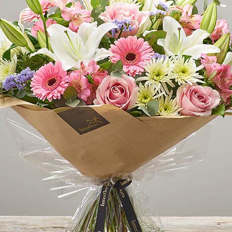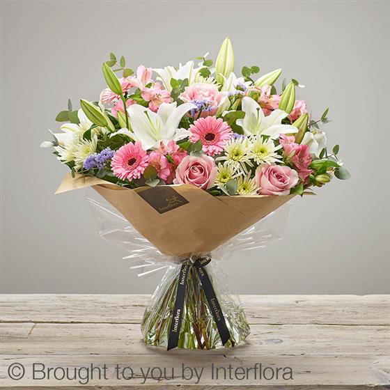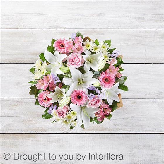 Featuring pink alstroemeria, white Oriental lilies, pink large headed roses, white spray chrysanthemums, lilac statice and pink germini with eucalyptus cinerea and salal, presented in Gift Packaging.
