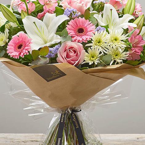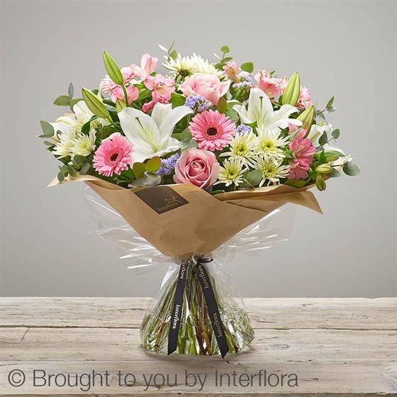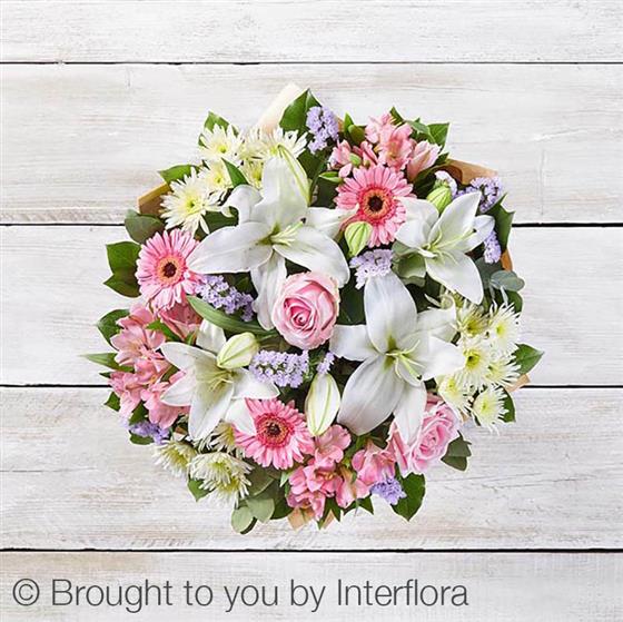 Featuring pink alstroemeria, white Oriental lilies, pink large headed roses, white spray chrysanthemums, lilac statice and pink germini with eucalyptus cinerea and salal, presented in Gift Packaging.