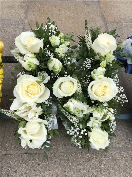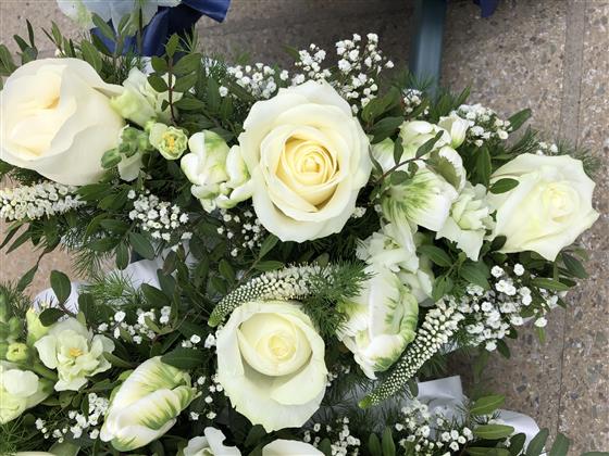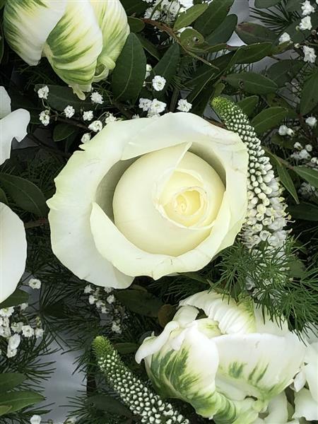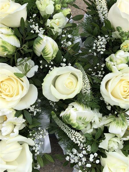 A mixed flower tribute letter in all whites. Mixed flowers include Parrot tulips, Veronicas, Roses, Carnations, Gerberas, Gypsophila, Chrysanthemums, Freesia and Spray roses.