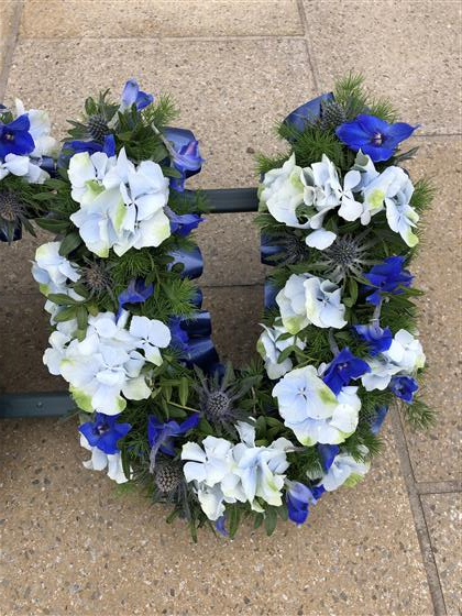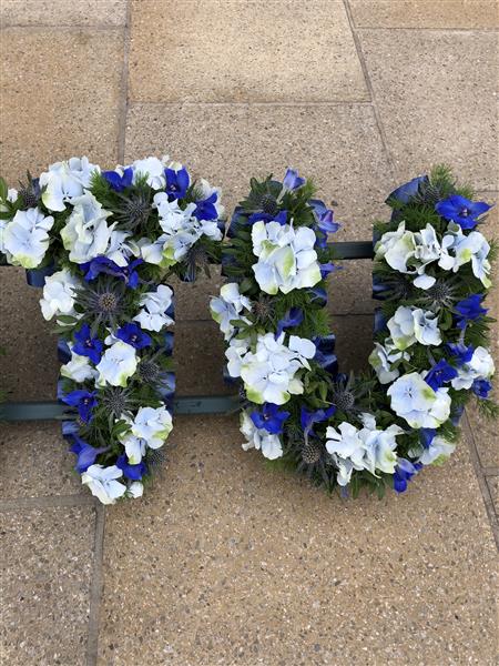 A tribute letter in mixed sky and dark blue flowers. Blue Hydrangeas, Blue Eryingium Thistles and Blue Delphinium with foliage.