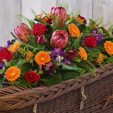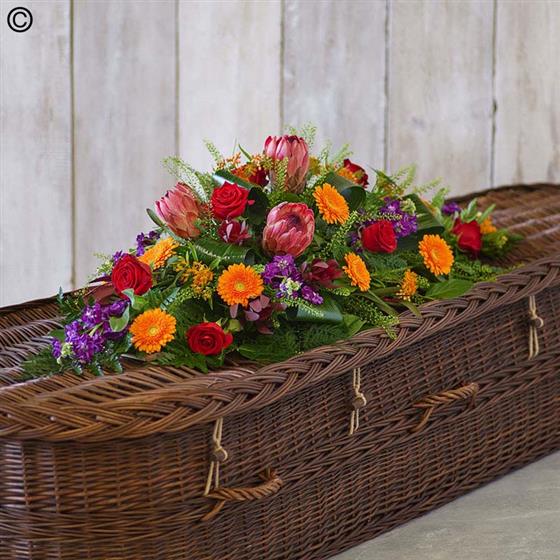 A fragrant spray of vibrant tropical tones and blooms including protea, stocks and germini.