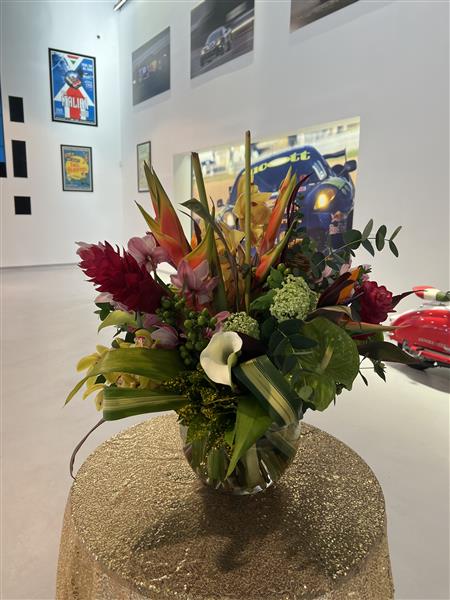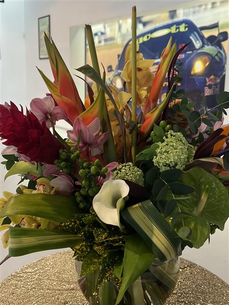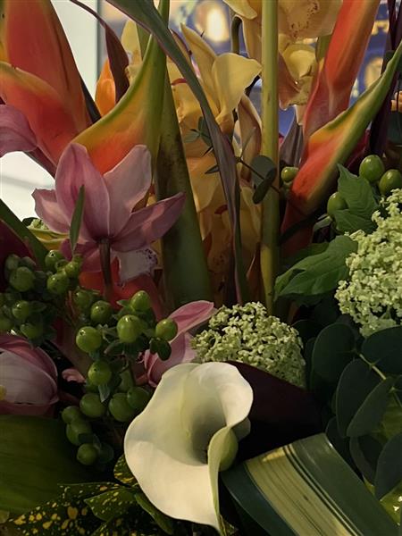 Bright Orange Strelitzia, Cymbidium Orchids, Orange Leucospurnums, Tropical Red Gingers, mixed Heliconias in an array of colours, Palm Leaves and Anthuriums.