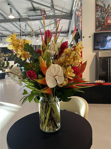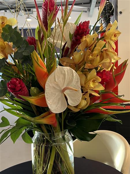 Bright Orange Strelitzia, Cymbidium Orchids, Orange Leucospurnums, Tropical Red Gingers, mixed Heliconias in an array of colours, Palm Leaves and Anthuriums. All expertly arranged and displayed in a nice glass vase.