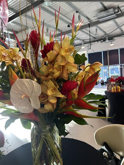A tropical flower vase containing exotic colourful flowers from all over the world.