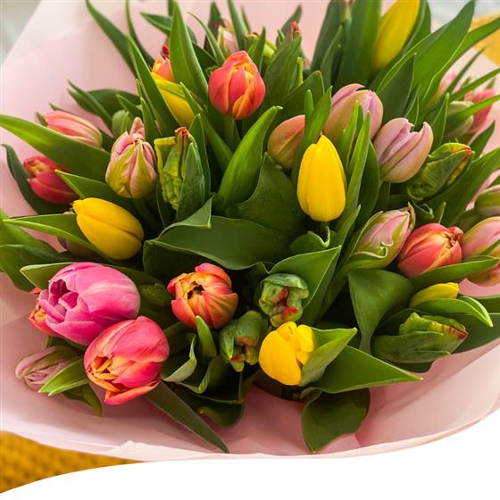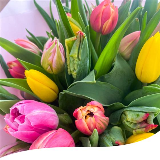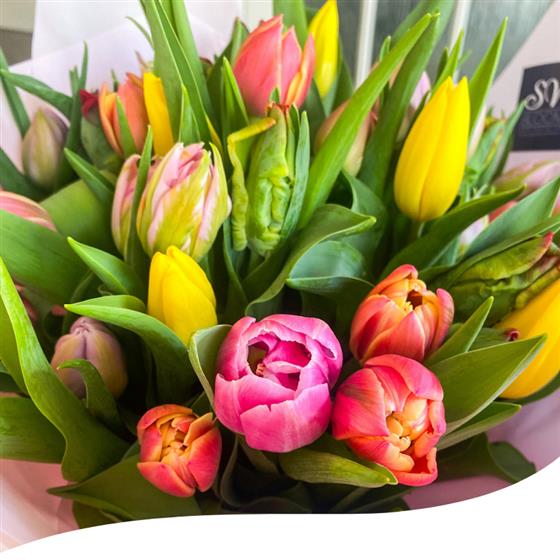 A wonderland of amazing tulips beautifully arranged and hand tied. Stunning array of tulips create this beautiful bouquet. Double tulips, parrot tulips and twin tulips make up this rare bouquet.