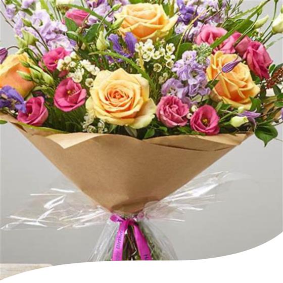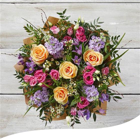 Meet our Tutti Frutti Hand-Tied in standard size – a striking fusion of nature's finest components. Revel in the harmonious blend of Peach Large-Headed Roses, Lilac Stocks, and Pink Lisianthus, artfully complemented by the understated allure of Purple Clematis and White Waxflower.