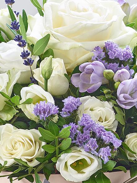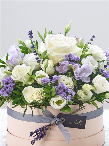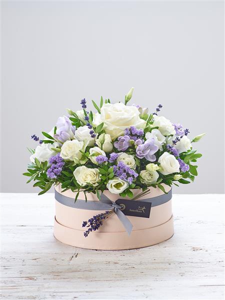 Featuring an ivory large headed rose, purple freesia, white spray roses, white lisianthus and lilac statice with pistache and dried lavender, presented in a soft nude hatbox.