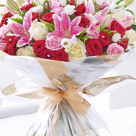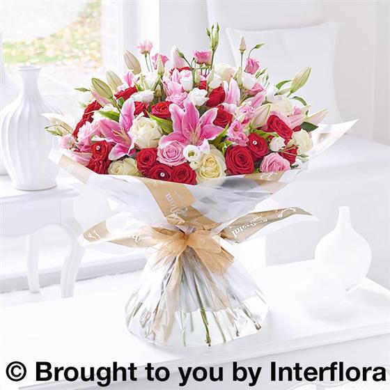 Featuring 25 red Naomi large headed roses, 10 pink large headed roses, 10 ivory large headed roses, 5 pink lisianthus, 5 white lisianthus and 5 pink Oriental lilies with dracaena and salal, wrapped and trimmed with a gold organza ribbon and 10 long diamante pins.