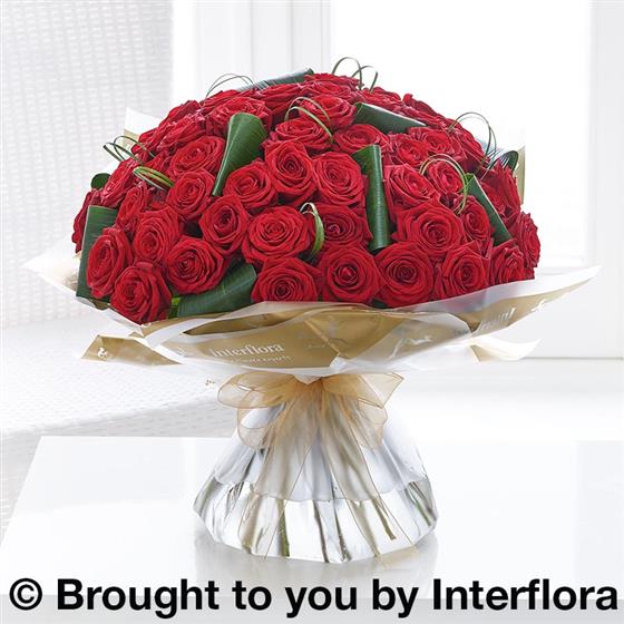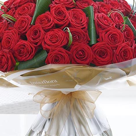 Featuring 50 large headed red Naomi roses handtied with asparagus fern, aspidistra leaf and bear grass and finished with gift wrap and ribbon.