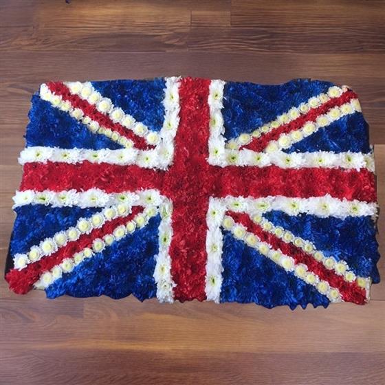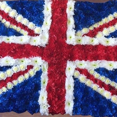 We used Red and blue sprayed Chrysanthemums and White Stallion to create this Union Jack flag flower tribute.