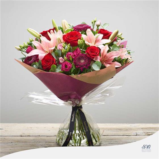 Each design is a unique masterpiece, crafted by our artisan florists using the freshest stems available on the day. While your gift may look different from the one pictured, it will still be just as lovely. Our medley of blooms in romantic hues includes at least one red rose.