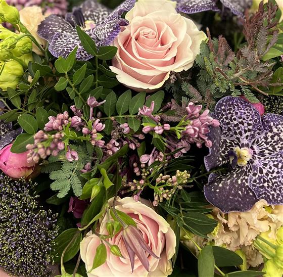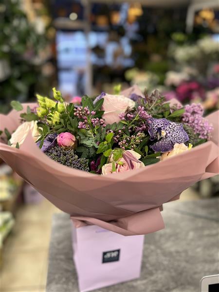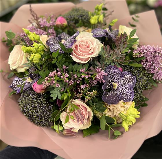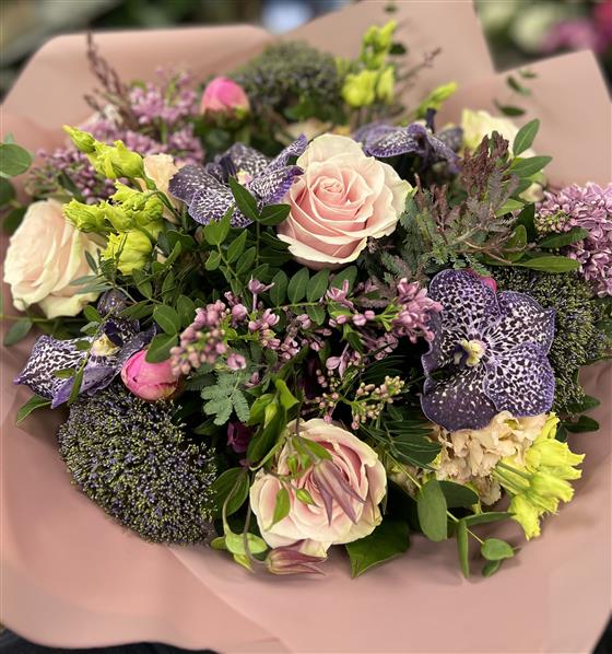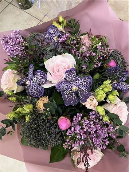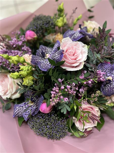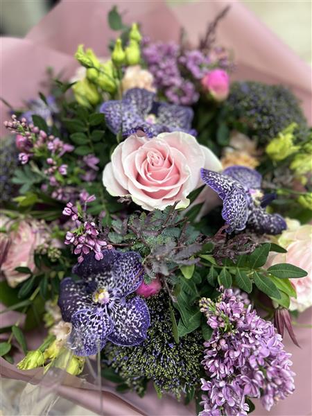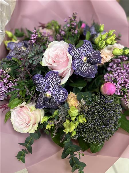 A truly one of a kind Vanda Orchid bouquet using Pink Mondial Roses, Pink Peony’s when stocked, Purple Trachelium, Lilac Syringia and peach Eustoma Lisianthus are all expertly arranged by our florists and hand tied. Wrapped in beautiful gift wrapping and put into water and a bag as pictured.