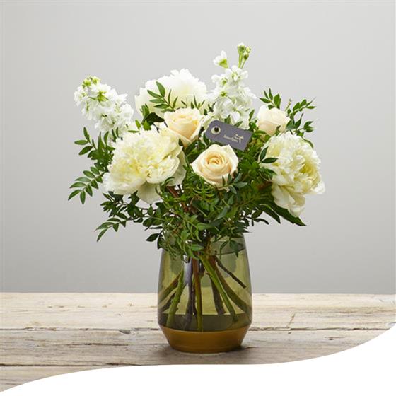Introducing the Vanilla Quartz Vase Arrangement, a sophisticated collection of summer flowers in elegant neutral tones. This exceptional assortment exudes timeless charm and grace, making it perfect for adding a touch of sophistication to any space.