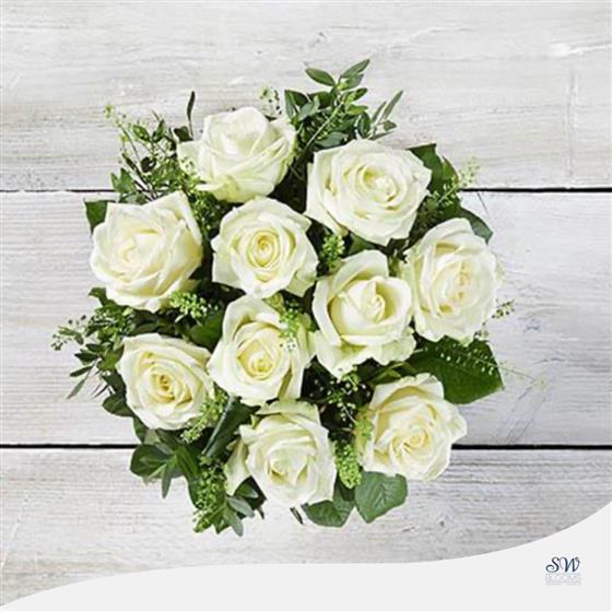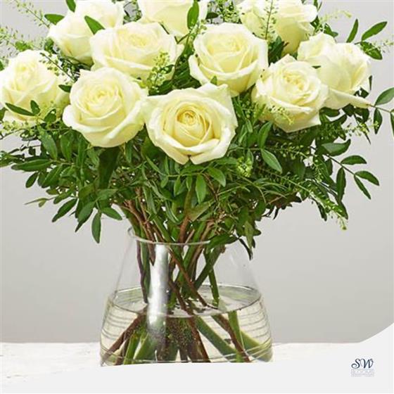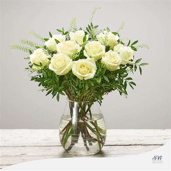 Presenting our exquisite bouquet – 10 Large Headed White Roses expertly hand-tied with Thlaspi and Pistache, elegantly displayed in a clear swirl glass vase.
