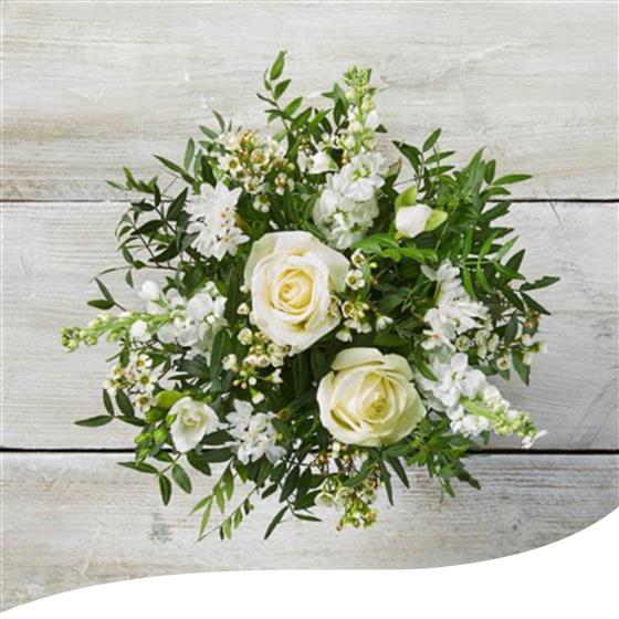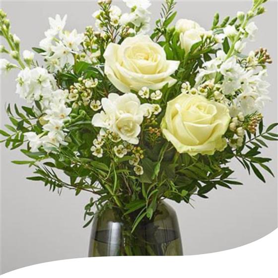 This Beautiful arrangement features a variety of elegant white flowers including Large Headed Roses, delicate Freesia, fragrant Narcissi, and lovely Stocks surrounded by delicate White Waxflower, all arranged in a stylish Green Glass Vase. The combination of these stunning white blooms creates a sense of elegance and sophistication, making this arrangement a perfect gift for a loved one, friend or colleague. Whether you're looking to brighten up your home or office space or to show someone how much you care, this beautiful White Flower arrangement is sure to impress.