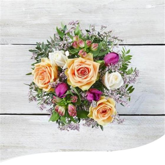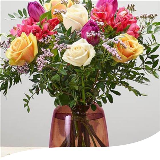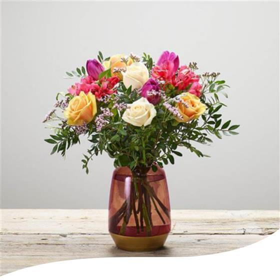 This beautiful and delicate arrangement features Peach Large-Headed Roses, Cream Large-Headed Roses, Purple Tulips, Cerise Alstroemeria and Pink Limonium with Pistache, all arranged in a pink glass vase. The combination of these vibrant colours and textures create a striking visual impact that will brighten up any room or occasion. Whether you're looking for a thoughtful gift for a loved one or just want to treat yourself, this bouquet is sure to impress.