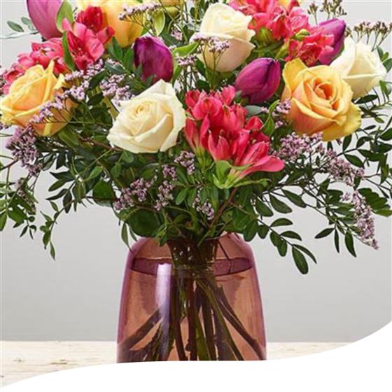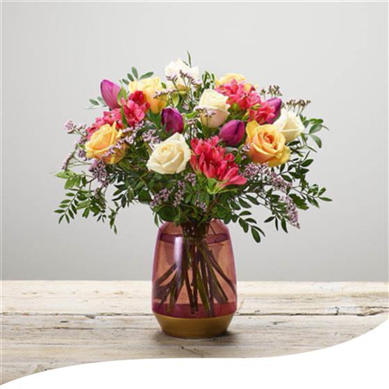 To add an extra touch of charm, this beautiful arrangement is presented in a pink glass vase. The contrasting colours and the artistic arrangement make this arrangement a perfect gift for expressing love, admiration or celebrating a special occasion.