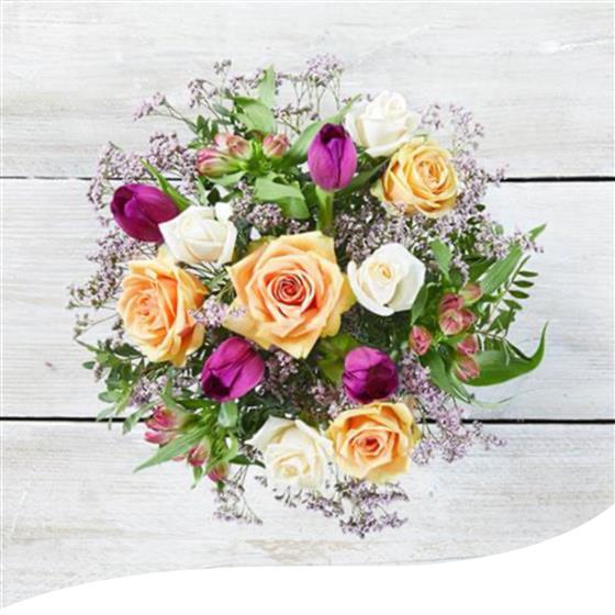 Introducing our delightful Peach Sundae Vase, a charming ensemble that combines the elegance of peach and cream Large-Headed Roses with the vibrant hues of Purple Tulips, Cerise Alstroemeria and Pink Limonium. Expertly arranged with accents of Pistache, this bouquet is a celebration of diverse colours and textures, creating a harmonious and visually stunning display.