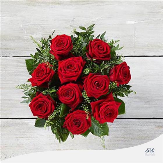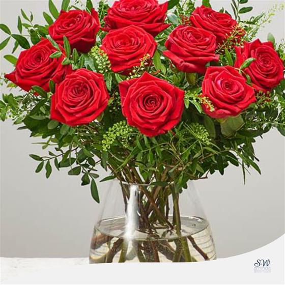 Indulge in the timeless beauty of our Scarlett Surprise Vase, a captivating arrangement featuring 10 Large-Headed Red Roses expertly hand-tied with Thlaspi and pistache. This stunning bouquet is presented in a clear swirl glass vase, adding an extra touch of elegance to your gesture.