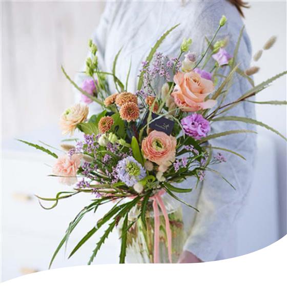 For a contemporary twist, explore our trending style featuring blooms in apricot, peach, lemon, and cream tones. This modern arrangement includes dried flowers and grasses, adding an artistic and textural dimension to the bouquet that aligns with the latest floral trends.