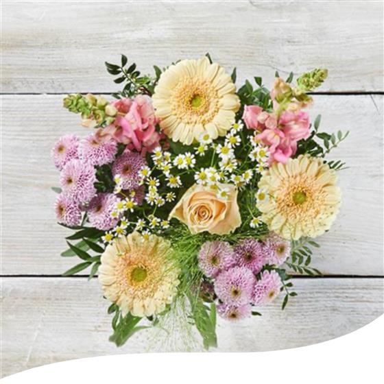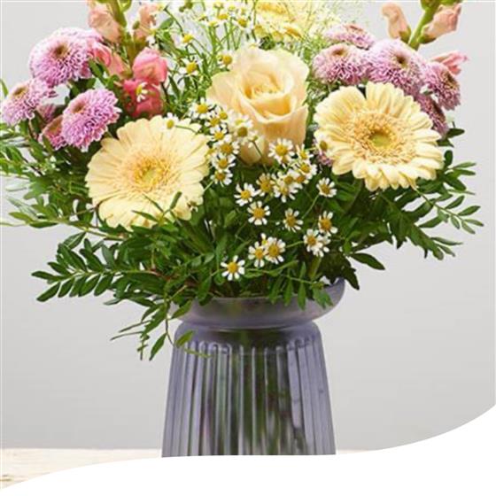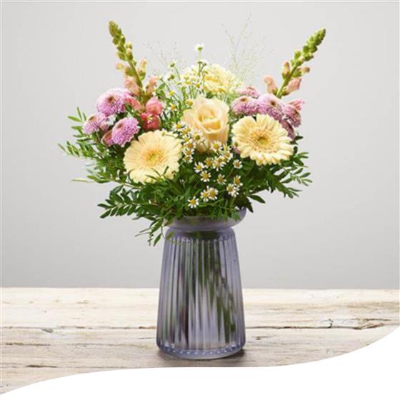 This Vase Arrangement is a symphony of colours and textures expertly curated to bring joy to any space. This bouquet showcases the delicate beauty of Pink Antirrhinums, a Cream Large-Headed Rose, Pink Spray Chrysanthemums, Cream Germini and White Tanacetum. Each bloom is thoughtfully paired with accents of Pistache and Panicum Grass, creating a harmonious blend of elegance and natural charm.