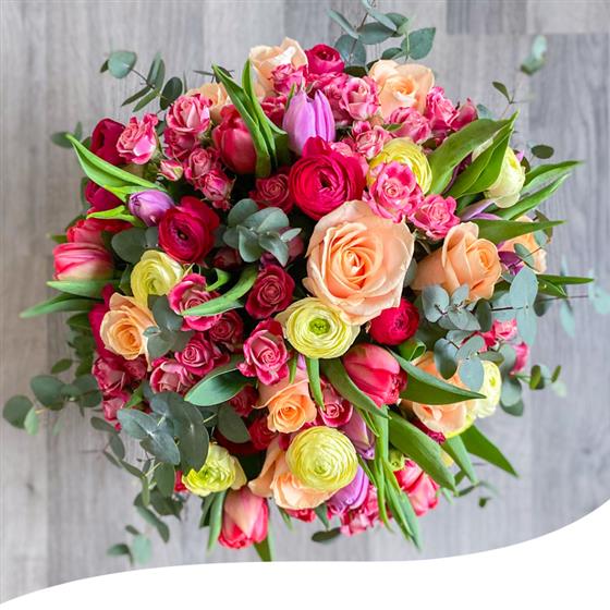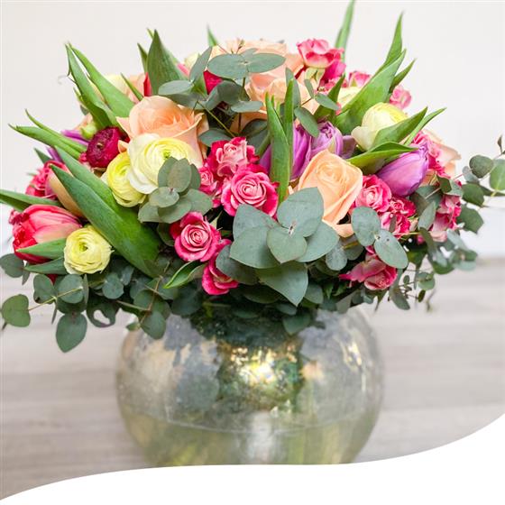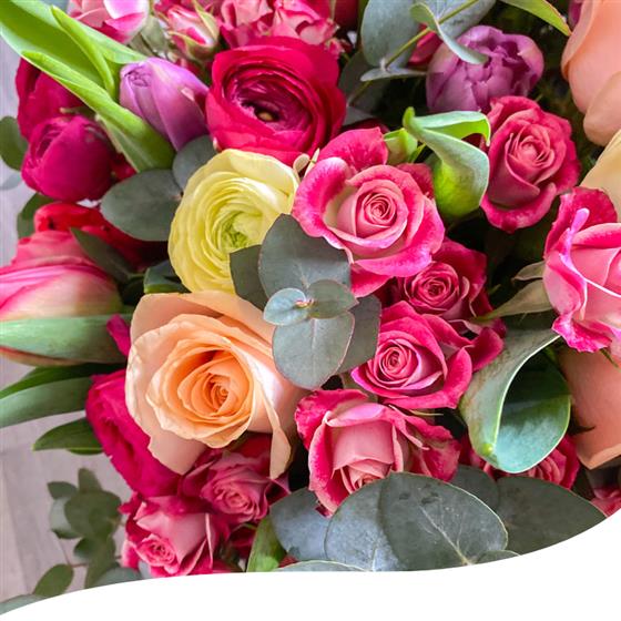 Indulge in elegance with our exquisite Vase Arrangement - Pink Floral Haven, delicately arranged in a luxurious Crackled Vase. This stunning ensemble showcases a captivating combination of Pink Spray Roses, Pearl Avalanche Roses and delicate white and Pink Ranunculus, complemented by a bunch of vibrant Pink Tulips. Enhanced with the refreshing fragrance of Eucalyptus, each bloom is thoughtfully curated to elevate any space with timeless beauty and charm.