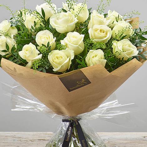 Featuring 18 large headed white roses hand-tied with thlaspi, salal leaves and pistache, and presented in Gift Packaging.
