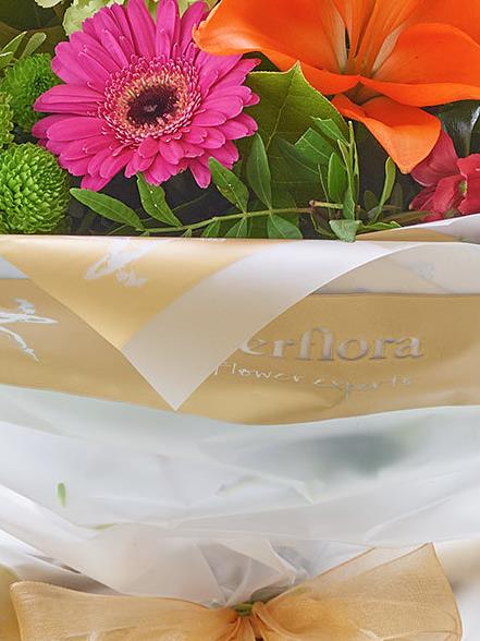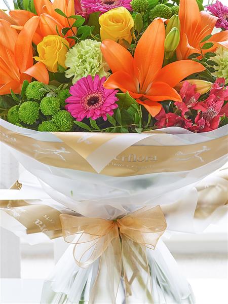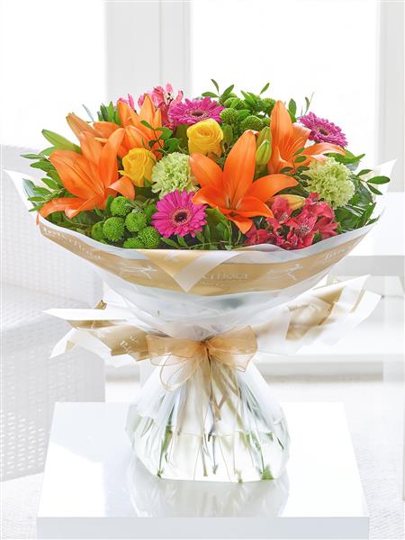 Featuring pink alstroemeria, green carnations, cerise germinis, yellow Asiatic lilies, orange large headed roses and green spray chrysanthemums with pittosporum and salal, handtied, gift wrapped and presented in gift packaging.