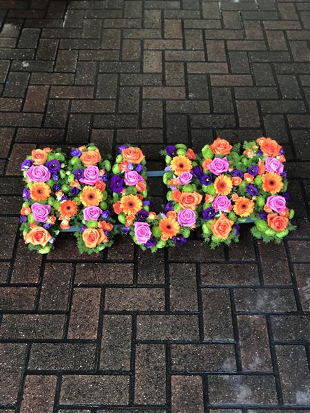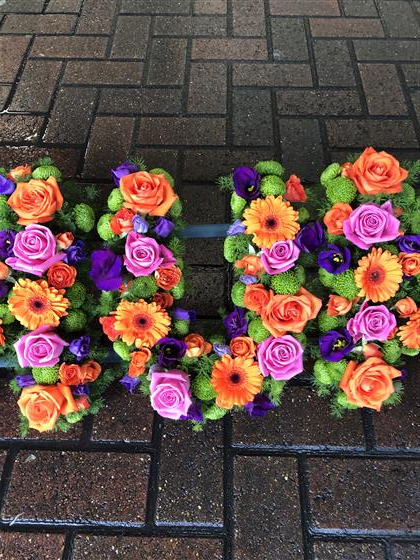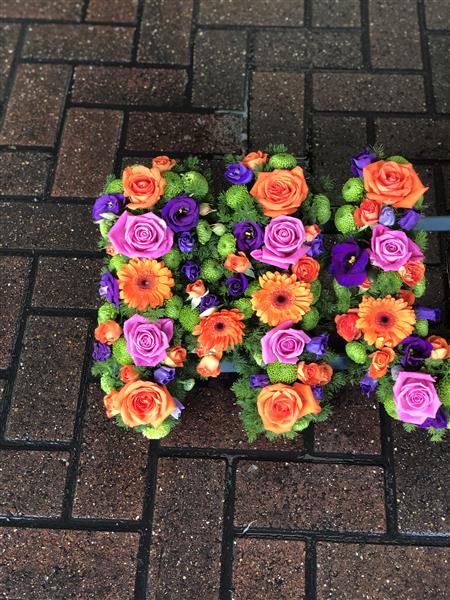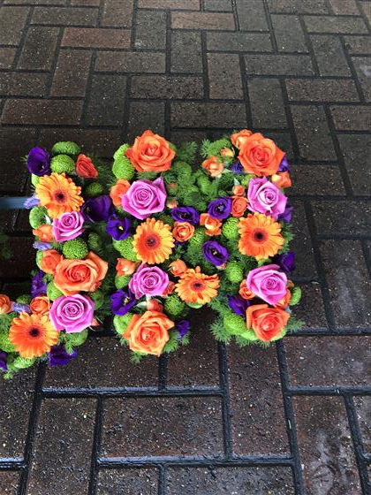 A vibrant Mum tribute using a mixture of bright and vibrant flowers. Gerberas, Mixed Large Roses, Orange Babe Spray Roses, Green Kermit Chrysanthemums Purple Lisianthus and mixed foliage.