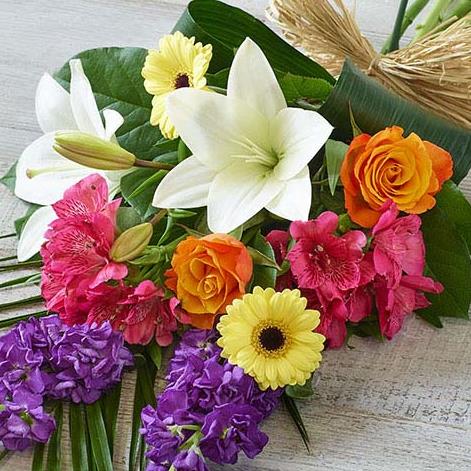 A bright, beautiful and fragrant combination of lilies, roses and stocks. Also featuring alstroemeria and aspidistra.